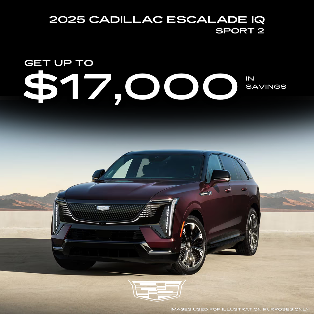 "DISCLAIMER:Applies to 2025 Cadillac Escalade IQ Sport 2. Stock #25D157L / SU108211. MSRP $154,790. Dealer discount $12,000. Includes $5,000 Cadillac Financial APR & Down Payment Assistance; must finance through GM Financial to qualify. Some incentives require qualification; not all customers will qualify for all incentives. Vehicle is a previous daily rental/loaner with current mileage of 4,631. Prices do not include government fees and taxes, any finance charge, dealer document processing charge, electronic filing charge, or emissions testing charge. Offer expires 04/30/2026."